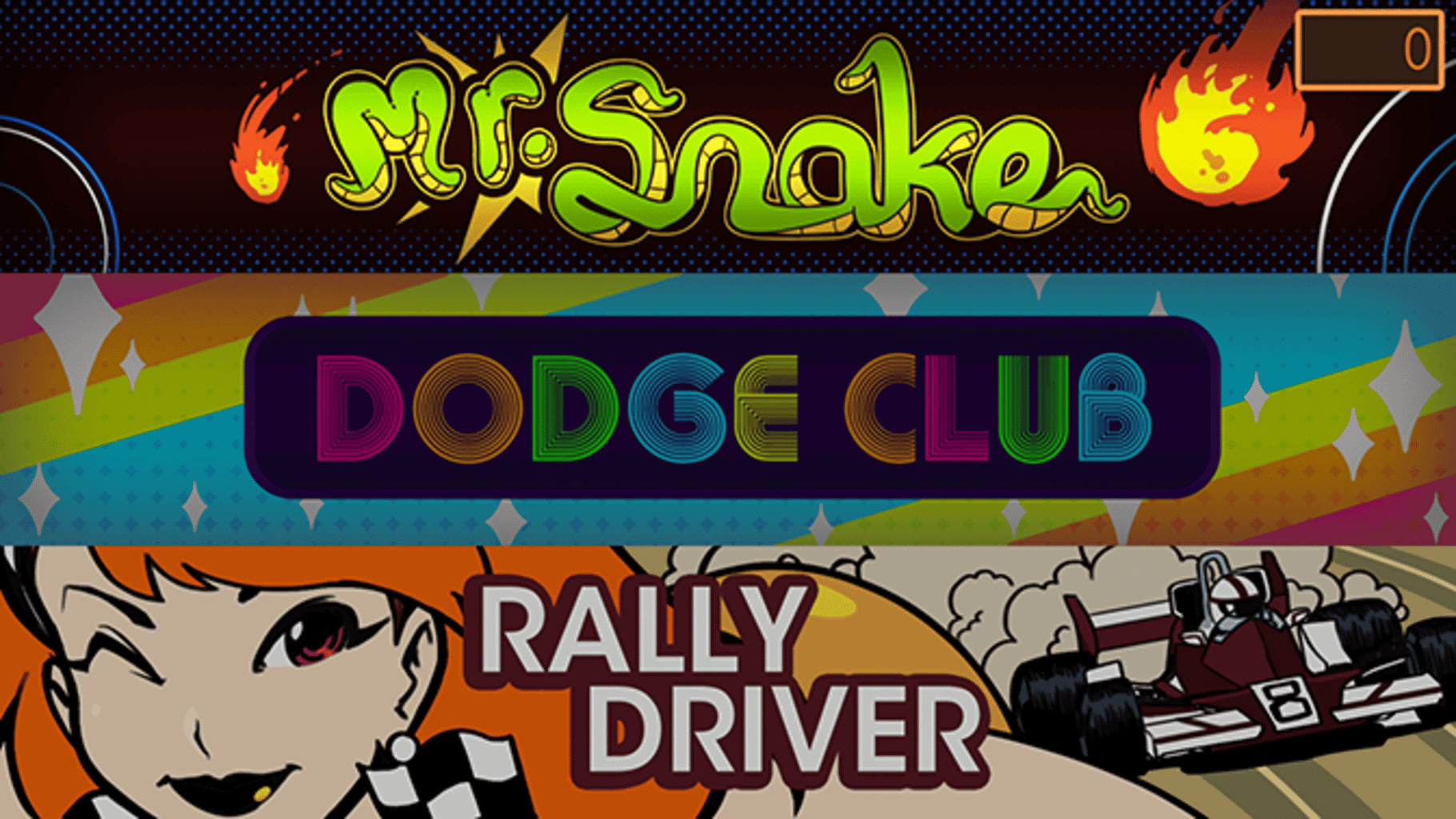 Three full-color games, including Dodge Club, Rally Driver, and Mr. Snake