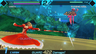 Fate/Extra is a dungeon crawl style Japanese role-playing game. The game takes place in a parallel universe to the visual novel Fate/stay night. At the start of the game, the player may choose to play as either a male or female character, as well as selecting one of three Servants — Saber, Archer, or Caster, each with different strengths and weaknesses. Players spend one ingame "week" interacting with other characters, viewing scenes that advance the game's story, talking to their Servant in their room, and gathering clues to the identity of the enemy Servant. At the end of each day, they enter the Arena, a dungeon in which they can battle monsters to gain experience points and strengthen their Servant. The game's turn-based battle system is comparable to rock-paper-scissors -- "Attack" overpowers "Break", Break overpowers "Guard", and Guard overpowers Attack. During battle, both the player and the opponent line up six such moves at the beginning of each turn.
