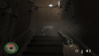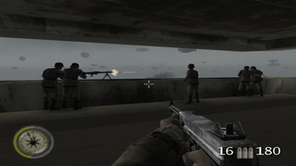 Frontline is a first-person shooter where players take control of the protagonist player character in a first-person perspective where they fight through levels set during the Second World War against the Wehrmacht using historical weaponry of the era, performing a series of military operations. Briefings take place at the start of each mission, which advance the plot and introduce new characters. Each mission is structured through a number of linear levels, each with differing locations, levels of action and styles of gameplay. Initially the player character begins on the frontlines during D-Day backed up by other computer AI-controlled soldiers with an emphasis on fast action-orientated gun-based gameplay. As the story progress however, the player character is sent on a variety of other missions including a number of covert and undercover operations in locations such as military based, German-occupied towns and manors, submarines and countryside settings. The player character is tasked with objectives during levels that range from infiltration, espionage, rescue and recon. Because of the variety between missions and locations, gameplay also changes pace. While many missions involve Allied assaults on German targets others include elements of stealth and exploration. For example one selections of missions has the player detach from an allied raid to infiltrate a German U-Boat in order to get to a secret facility while another has them rendezvous and sneak into a German headquarters in disguise to rescue an operative. Many missions are performed solo yet some include an AI companion for backup. Health is determined by a health bar that can be replenished using a selection "medikits" found throughout levels with varying degrees of effect. During missions, players can earn medals by the end of each level be meeting requirements such as completions of objectives, eliminating an amount of enemies and maintaining a percentage of health throughout, all represented by a bronze, silver or gold star.