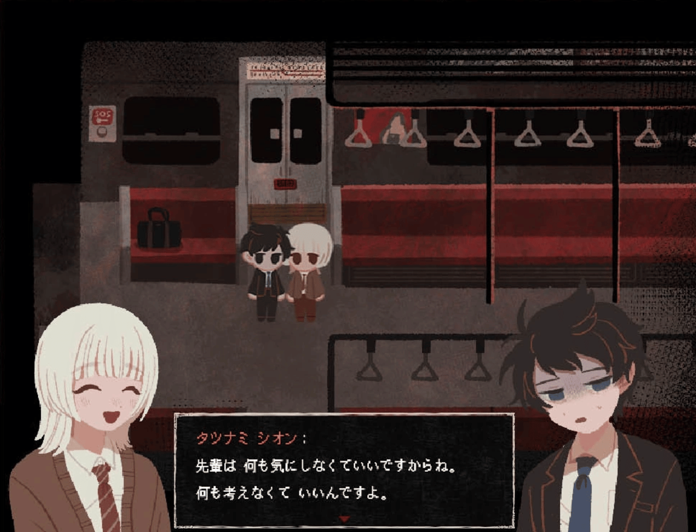 I overslept the last train and ended up at a strange place called "Saihate Station". "Haru Akinashi" is a servile office worker who lacks self-confidence and is no good at anything he does. After sleeping in the last train, he finds himself trapped in a strange place called ``Saihate Station'' where horrific and mysterious phenomena occur. "Shion Tatsunami", a bright and talented colleague and former friend who is in contrast to the protagonist, also happens to be there, and they promise to cooperate and return together. The two had been estranged for a while, which made things awkward at first, but each time they overcome difficulties, they remember the distance they once felt and deepen their bond even more. The truth of the world approaches there. What are the consequences of perverted emotions? Where did the two end up?