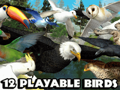 Soar into a brand new adventure as a majestic Eagle, swift Falcon, or a colorful Parrot! For the first time ever, choose from TWELVE PLAYABLE BIRDS! Hunt down food in a massive realistic world, lay eggs, raise your flock, and unlock exciting new playable birds as you experience the life of a bird! Download the Ultimate Bird Simulator today while it's 50% OFF for a very limited time! Brand New Features REALISTIC SIMULATOR You'll need to maintain your health, hunger, thirst, and energy while ruling over the vast blue skies! TWELVE PLAYABLE BIRDS Choose from your favorite species of birds in a single game! Become a Eagle, Crow, Parrot, Duck, Owl, Falcon, Stork, Seagull, Bluejay, Toucan, Cockatoo, and a Hummingbird! Each species has their own families, experience, and levels! DANGEROUS BOSS BATTLES Test your skills against SIX thrilling boss battles! A deadly winged foe who lives off of blood lies in wait! A dangerous predatory feline is waiting in the snow covered peaks to pounce on your entire flock! BUILD YOUR FLOCK Dominate other birds or bring them a treat to recruit them to your family! Customize and play as any bird in your flock and create a powerful family! RAISE YOUR BABIES Hatch babies that will grow into powerful members of your family! Care for you babies while they are are young, finding food for them and carrying them in your mouth! CUSTOMIZE YOUR BIRDS Choose your animal’s name, appearance, skills, and attributes to complement your flock members and become a more powerful group! LEVEL UP YOUR BIRDS Gain experience by catching and eating your prey, caring for your family, and completing missions! Level up your birds to increase their health and attack damage, earn points to upgrade your stats, and increase the size of your flock! EARN STAT POINTS Stat Points can be used to provide bonus’s to traits like Health, Critical Attack Chance, Flight Speed, and much more! UPGRADEABLE BUFFS Buff Points can be used to upgrade your Screech and Call Buffs, which create temporary Stat Boosting auras around your bird when active! RAGDOLL PHYSICS Your prey now realistically dangles from your talons as you carry them! DYNAMIC WEATHER, SEASONS AND DAY/NIGHT CYCLE Procedural weather system with unique storms, clouds, sun, and stars! And the BRAND NEW changing seasons! MASSIVE REALISTIC 3D ENVIRONMENT Explore a world so big we created SIXTEEN unique dens for your birds to live in! Explore a dense mountainous forest, a tropical jungle island, an arid rocky land, and the frosted peaks of the arctic! DOZENS OF ENEMIES Hunt down animals like squirrels, rabbits, mice, deer, birds, crab, fish, raccoon, fox, beetles, grub, worms, ants, geckos and many more! Smaller birds can scavenge for fruit, seeds, and nectar from flowers! OPTIONAL BLOOD EFFECTS If you are of age or have your parents permission, turn on the BRAND NEW blood effects for added combat ferocity! GLUTEN-FREE PROMISE With all of our games you will always get the full game with no ads or additional purchases! Download the Ultimate Bird Simulator to transport yourself to the wide open skies and experience the high flying life of your favorite bird! If you liked living as a Bird then you'll love our other animal simulators! Download our Ultimate Wolf Simulator and live a wild life in the forest, or turn the Ultimate Dinosaur Simulator and discover a long lost Prehistoric World of Dinosaurs! Give us a shout and let us know what you want to play next! facebook.com/glutenfreegames twitter.com/glutenfreegames